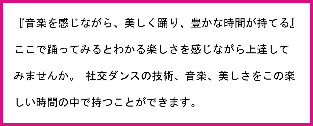 音楽を感じつつ美しく一緒に踊る社交ダンスを楽しく踊れるようになります。
